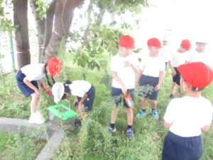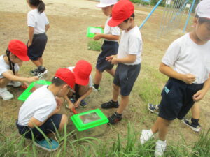 1学年は、4時間目に生活科の学習を行いました。今日は、虫たちがくらしやすい環境を考えました。子供たちは「土をもう少し増やそうかなあ」「草が少ない気がする」など、飼育している虫たちのことを想像しながら、グラウンドで土や草を集めて環境を整えました。