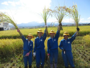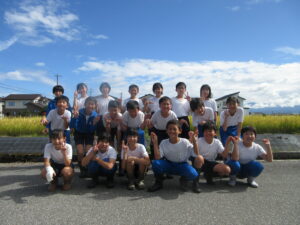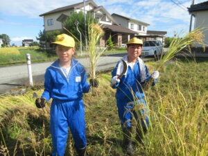 5学年は、1・2時間目に、5月に田植えをしたR&Vのざわ農場(株)さんの圃場で、稲刈り体験をしました。稲の刈り取り方を教わった後、田んぼに入り、稲を刈り取りました。始めは鎌の使い方に苦戦していた子もいましたが段々とコツを掴み、友達と声をかけ合いながらスムーズに取り組んでいました。