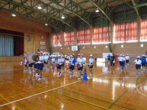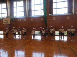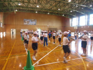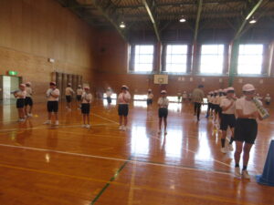 4・5・6学年は、4時間目に運動会で披露する鼓笛隊の練習を行いました。始めに隊形移動の練習をした後、全体を通しました。今日は2回目の練習でしたが、動くタイミングと位置を覚えてスムーズに移動することができていました。