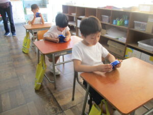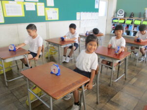 1学年は、4時間目に算数科で「なんじなんぷん」の学習を行いました。時計の針合わせゲームを行い、時刻を模型時計で表しました。