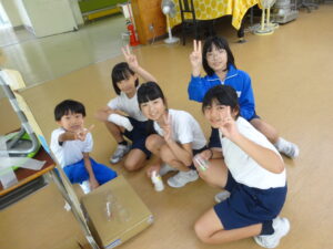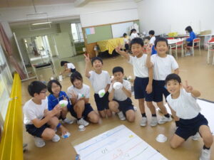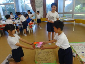 2学年授業(生活科) 2025年10月11日 2年, 5年 10月10日(金) 2学年は、2時間目に生活科の「おもちゃランド」に5学年を招待しました。最初に、おもちゃを一緒につくりました。その後は、工夫してつくったおもちゃやゲームの遊び方を説明し、遊んでもらいました。