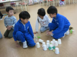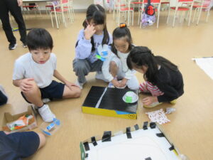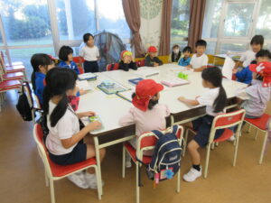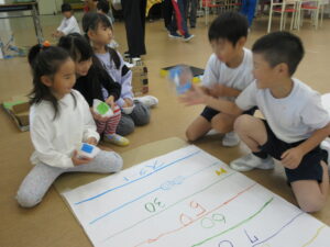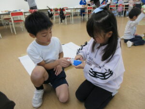 2学年は、3時間目に生活科の学習を行いました。年長児をおもちゃランドに招待し、一緒におもちゃをつくったり遊んだりしました。