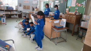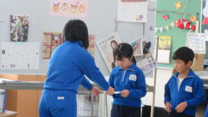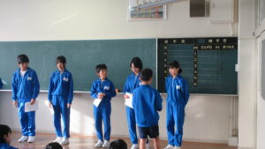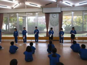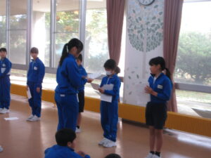 全校児童は、朝活動の時間に、図書委員会主催の「本は友達発表会」をしました。1・2学年は図書室で、3・4学年は第2ランチルームで、5・6学年は相談室で各学年3名ずつの児童が「おすすめの本」を紹介しました。その後、図書委員が発表者に賞状を渡しました。