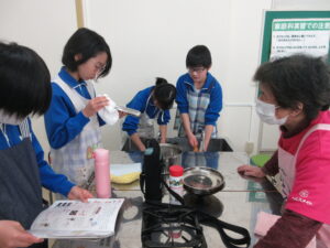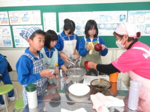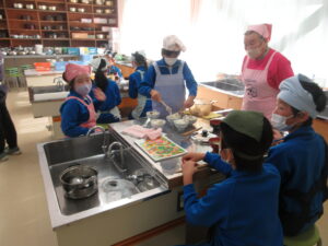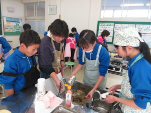 5学年は、1・2時間目に家庭科で調理実習を行いました。今日は、食生活改善推進協議会から4名の方をお招きし、ご飯を鍋で炊いて、煮干しでだしをとってみそ汁を作りました。グループの仲間と協力し、手際よく調理をしていました。子供たちは、「自分で料理を作ったのは宿泊学習以来だったけれど、美味しくできてよかった」「調理実習のために朝ご飯を食べなかったからたくさんおかわりしよう」と、自分たちで作ったものをうれしそうに食べていました。