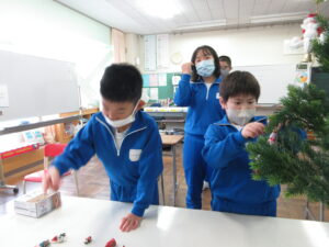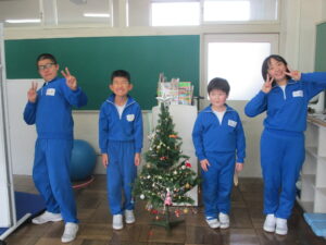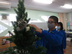 クリスマスツリーの飾り付け(なかよし級・かもめ級) 2025年12月1日 3年, 5年, 6年 11月28日(金) なかよし級とかもめ級は5時間目にクリスマスツリーの飾り付けをしました。みんなで協力してどこから見ても楽しめるクリスマスツリーになりました。