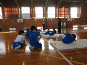 1学年は、3時間目に体育科の学習を行いました。今日は、マット運動をしました。ダンゴムシ等のいろいろな動きに取り組みました。