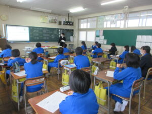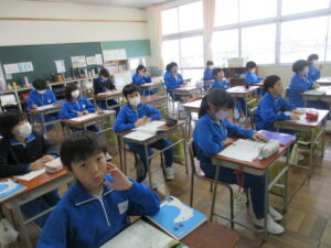 5学年は、3時間目に算数科で「単位量あたりの大きさ」の学習を行いました。秒速、分速、時速の意味や関係に気を付けて、時間と道のりから速さを求める問題や、速さと時間から道のりを求める練習問題に取り組みました。