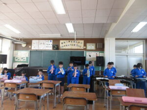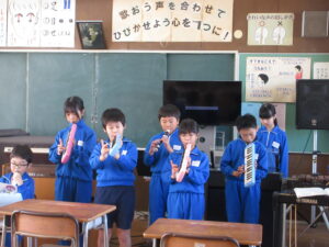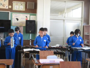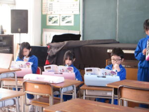 4学年授業(音楽科) 2025年12月11日 4年 12月11日(木) 4学年は、3時間目に音楽科の学習をしました。今日は、鍵盤ハーモニカ、リコーダー、鉄琴、木琴、低音楽器に分かれ、音の響きを味わいながら「茶色の小びん」を演奏しました。