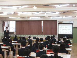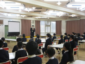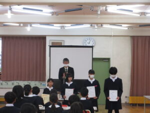 全校児童は、1時間目にランチルームで2学期の終業式を行いました。始めに校長先生の話を聞き、校歌を斉唱しました。その後、授賞集会を行いました。夏休みに応募した作品で優秀な成績を収めた児童の表彰をしました。最後に冬休みの生活で気を付けることについて話を聞きました。安全で楽しい冬休みを過ごし、始業式に元気に学校へ登校してくれることを教職員一同願っています。
