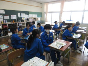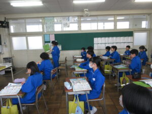 5学年授業(外国語科) 2026年1月20日 5年 1月19日(月) 5学年は、3時間目に外国語科の学習を行いました。今日は「We can~」の表現を用いて、ペアの友達と富山県内の建物や場所のクイズを作りました。