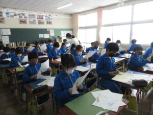 6学年は、6時間目に図画工作科で「わたしのお気に入りの場所」の学習を行いました。学校の中の自分のお気に入りの場所や、ランドセル、文房具等を描いた絵を一つ一つ切り取り、色画用紙の上に思い思いの配置で貼り付けました。完成後は、工夫したところや見てほしいポイントをロイロノートにまとめ、作品に込めた思いやこだわりを言葉で表現していました。