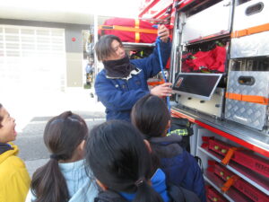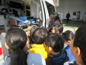 3学年は、2時間目と3時間目に社会科の学習で消防署へ行きました。始めに、消防士さんの1日の仕事の流れや火災についてお話を聞きました。通信指令室等の施設を見学させていただいたり、救急車・消防車・救助工作車に積まれている器具や道具を実際に見せていただいたりしました。ありがとうございました。