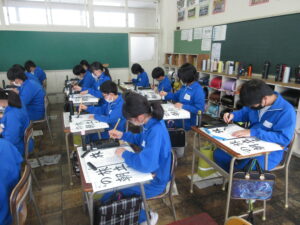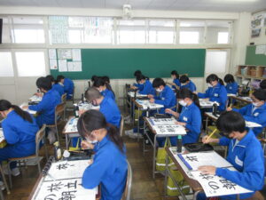 6学年は、2時間目に国語科で書写の学習をしました。「旅立ちの朝」の文字を、姿勢や筆使いを意識しながら、集中して書きました。