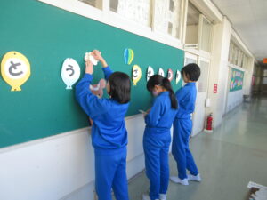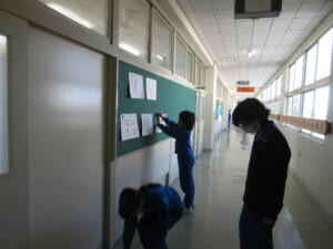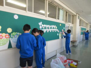5学年は、4時間目に卒業式に向けて学校の廊下に飾り付けをしました。廊下での作業なので他の学年の授業の妨げにならないよう、静かに作業を進めながら、友達と協力して飾り付けに取り組んでいました。