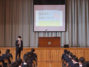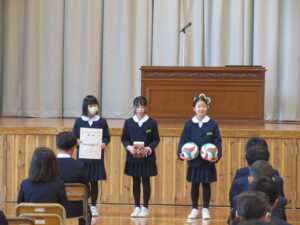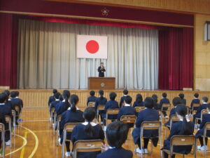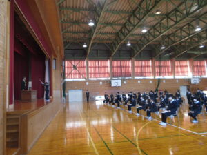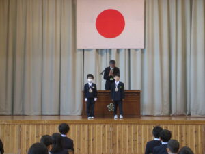 全校児童は、1時間目に体育室で修了式を行いました。はじめに、各学年の代表が校長先生から修了証を受け取りました。続いて、校長先生から「1年間を振り返ること」についてのお話がありました。式の後には、自学ノートを7冊達成した児童の表彰と、優秀な成績を収めたスポーツ少年団の紹介が行われました。その後、春休みの過ごし方についてのお話を聞きました。最後に離任式も行われ、来年度に他校へ異動となる教職員からお話がありました。1年間、学校運営にご理解とご協力をいただき、ありがとうございました。