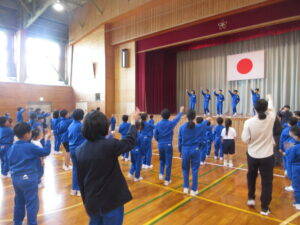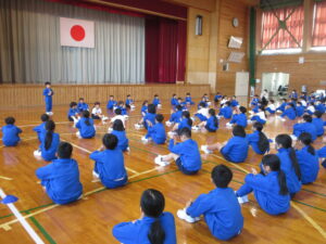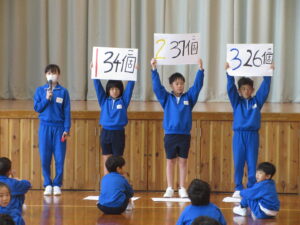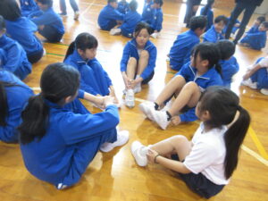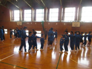 2時間目に体育室に全校が集まり、1年生歓迎集会を行いました。1年生の入場を拍手で迎え、6年生の始めの言葉の後、1年生が元気に自己紹介をしました。その後、6年生が考えた「生地小学校クイズ」をはじめ、「もうじゅうがり」「じゃんけん列車」のゲームをして楽しみました。感想タイムでは、「今日の集会で、1年生と交流できてとても楽しかったです。」と話していました。