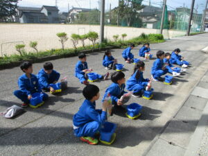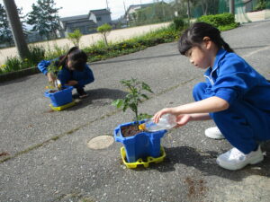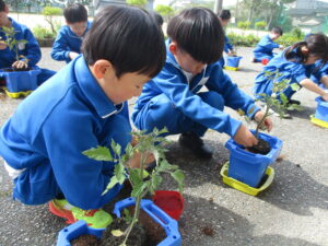 2学年は、1時間目に生活科の学習を行いました。トマトの苗を一人一つずつ植え、土をやさしくかぶせたり、水をあげたりしました。子供たちは、「早く大きくなってほしいな」「おいしいトマトができるといいな」と話しながら、これからの生長を楽しみにしている様子でした。